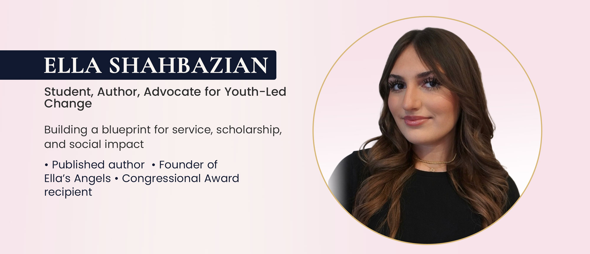 Ella Shahbazian is a student, author, and nationally recognized youth leader dedicated to building a kinder, more connected world. She is a sophomore at Rose and Alex Pilibos School in Hollywood, California, and a dual-enrollment student at Los Angeles Community College (LACC), where she is completing university-level coursework while maintaining a 4.0 GPA.